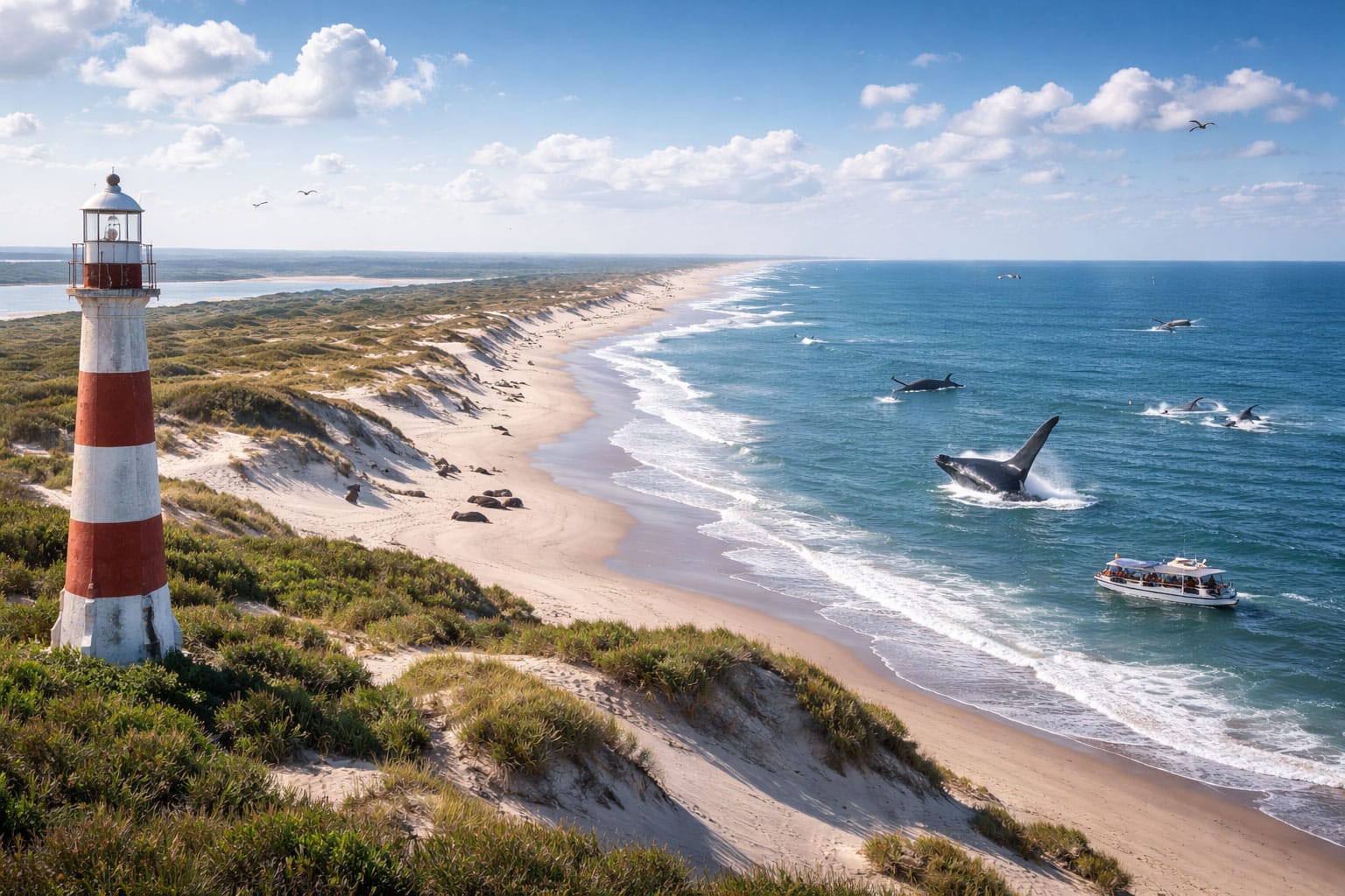 Outro atrativo forte é a possibilidade de avistamento de fauna marinha e costeira. Registros públicos e materiais de divulgação sobre o Albardão destacam a presença sazonal ou recorrente de animais como pinguins, lobos-marinhos, baleias, tartarugas e botos em diferentes trechos do litoral sul gaúcho. Como se trata de uma área marinha ampla, esse potencial de observação existe tanto a partir da faixa costeira quanto em passeios de navegação compatíveis com a área.